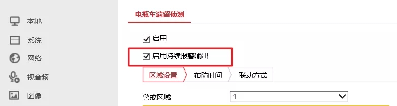 (1) 開啟持續(xù)報(bào)警輸出:只影響監(jiān)控ALARM端子的報(bào)警輸出,即:若算法持續(xù)檢測(cè)到電瓶車目標(biāo)在相應(yīng)區(qū)域,則報(bào)警持續(xù)的輸出;此時(shí),報(bào)警輸出的延時(shí)時(shí)間建議配置為5S。