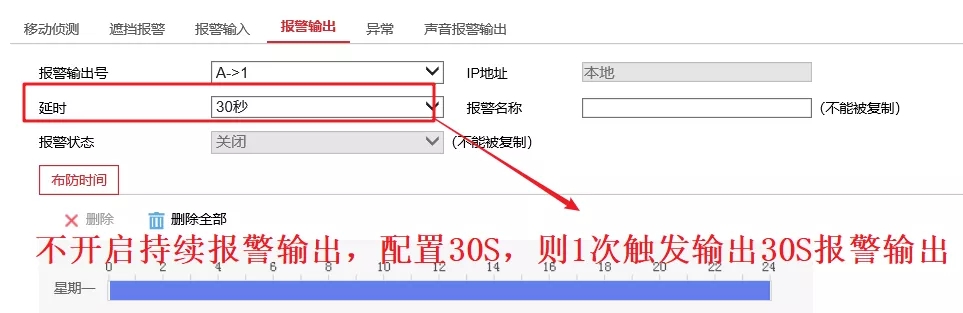 (2)在不啟用持續(xù)報(bào)警的前提下,則檢測(cè)到目標(biāo)后,按照延時(shí)時(shí)間配置進(jìn)行報(bào)警輸出。如配置30S,則觸發(fā)一次語(yǔ)音報(bào)警輸出,報(bào)警輸出30S后消失。
