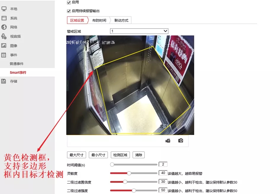 點(diǎn)擊【檢測(cè)區(qū)域】,繪制黃色的檢測(cè)框覆蓋電梯內(nèi)電瓶車檢測(cè)的區(qū)間范圍。為了不檢測(cè)到電梯墻壁上的物品影子、廣告牌、顯示屏滾動(dòng)播放的內(nèi)容,可繪制多邊形規(guī)則區(qū)域,避開電梯內(nèi)的廣告牌和側(cè)面壁的投影。