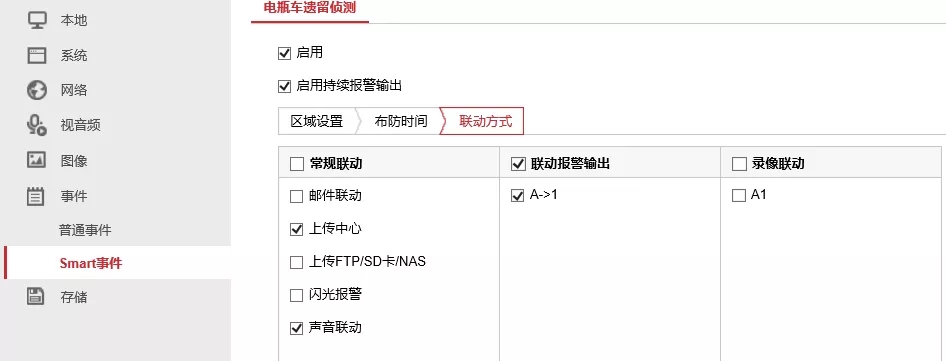 通過(guò)【事件】-【Smart事件】-【電瓶車遺留偵測(cè)】,勾選【啟用】和【開啟持續(xù)報(bào)警輸出】,繪制檢測(cè)區(qū)域。
